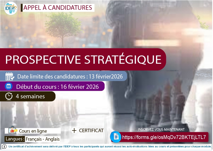 Le cours permettra aux apprenants de comprendre les implications des mégatendances mondiales pour l'avenir du monde et leurs implications pour l'Afrique. Ils acquerront des connaissances sur le rôle de la prospective stratégique dans la conceptualisation des stratégies de développement à long terme pour le continent. Ils auront également une bonne compréhension des concepts clés et des différentes étapes analytiques de l'approche prospective stratégique.